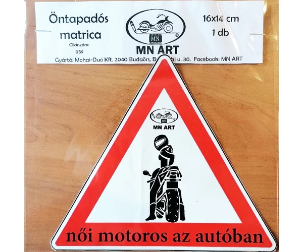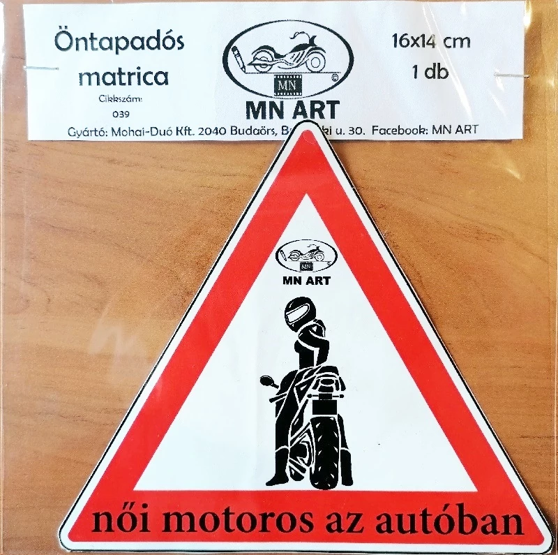 Női Motoros az autóban, háromszög matrica, öntapadós